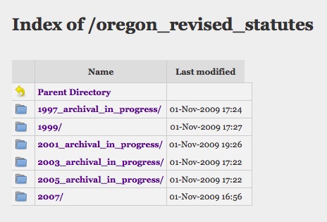 I knew I'd eventually integrate all these previous texts into OregonLaws.org. But until I get around to that, I realized we need a permanently accessible repository of raw source texts for a few reasons: (1) There's no good way for people to find out that these texts even exist, because the WayBack Machine doesn't allow search engines like Google to index its site: I had been searching in vain for these for a long time. (2) The state of Oregon takes down the old web pages when it updates the ORS. Since every document on OregonLaws.org cites its source with a link, I need to create a permanent location for these before they disappear off the web. (3) This archive will provide the raw materials for others to work with and innovate in ways that I haven't even thought of.