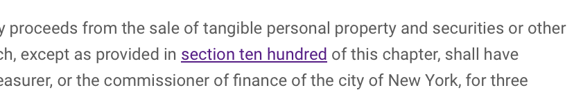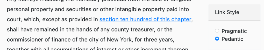 I live for programming challenges like this. Here's how I'm showing hyperlinks on N.Y. Abandoned Property Law § 600: